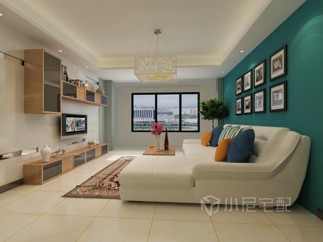 深色的背景,白白的沙發(fā),藍(lán)黃的抱枕,顏色交相呼應(yīng),整個(gè)空間看起來和諧而寧靜